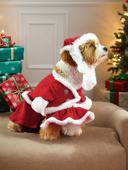 Pet's Contrast Piping Fur Trim Two Tone Button Christmas Dress with Hat