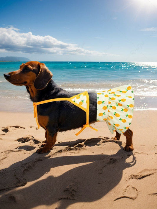 Pet's Pineapple Printed Hawaii Velcro Halter Contrast Piping Skirt Bikini Set