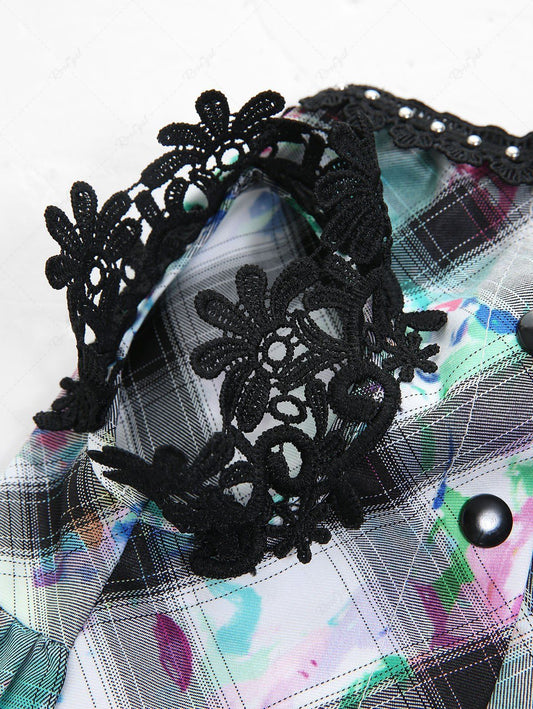 Pet's Plaid Painting Graffiti Printed Glitter Rivet Floral Crochet Trim Button Dress