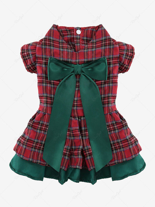 Pet's Plaid Printed Bowknot Ruffles Layered Button Christmas Dress