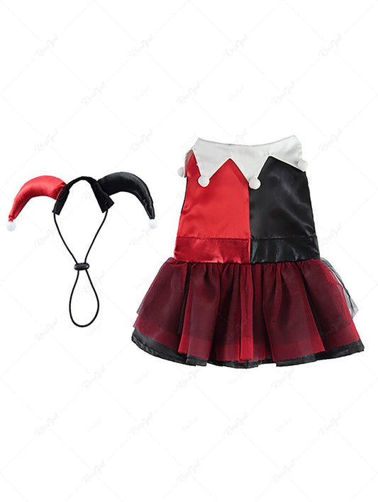 Pet's Halloween Costume Red And Black Patchwork Clown Cosplay Mesh Dress With Toggle Drawstring Headband