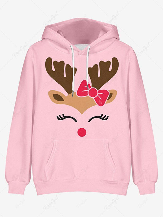 Plus Size Christmas Elk Bowknot Printed Pocket Drawstring Pullover Long Sleeves Hoodie