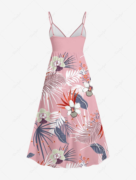 Plus Size Tropical Leaf Hibiscus Flower Print Hawaii Surplice A Line Cami Dress
