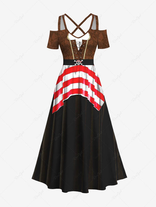 Plus Size Halloween Costume Pirate Style 3D Printed Cold Shoulder Crisscross Maxi Dress
