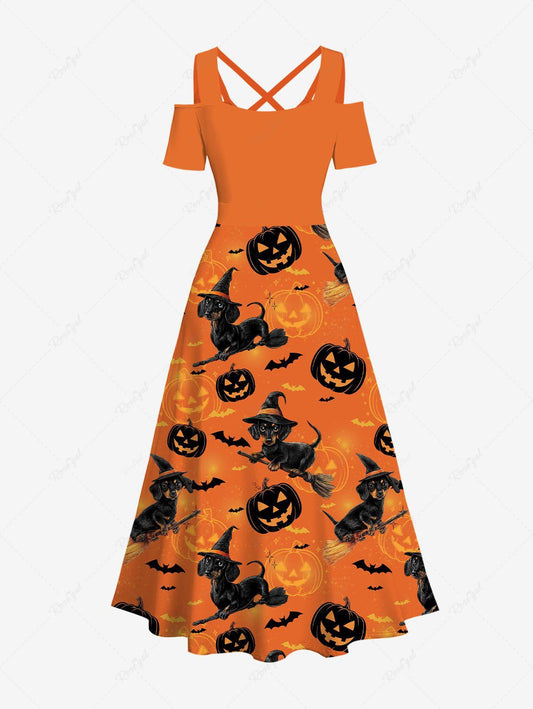 Plus Size Halloween Pumpkin Dog Bat Print Cold Shoulder Crisscross Maxi Dress