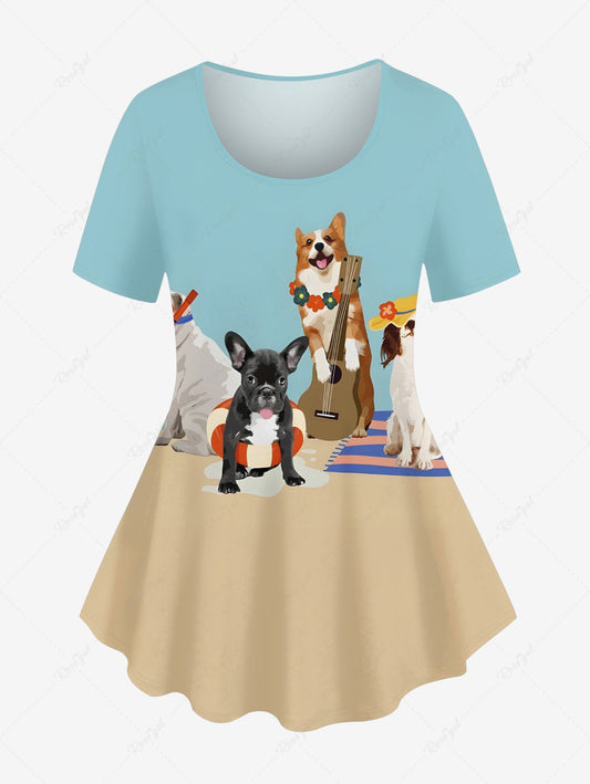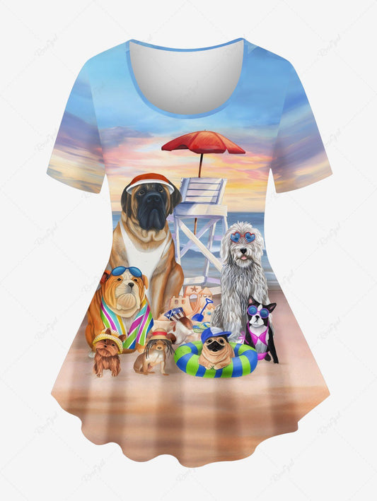 Plus Size Cute Dog Sea Beach Ombre Sky Printed Hawaii Women T-shirt