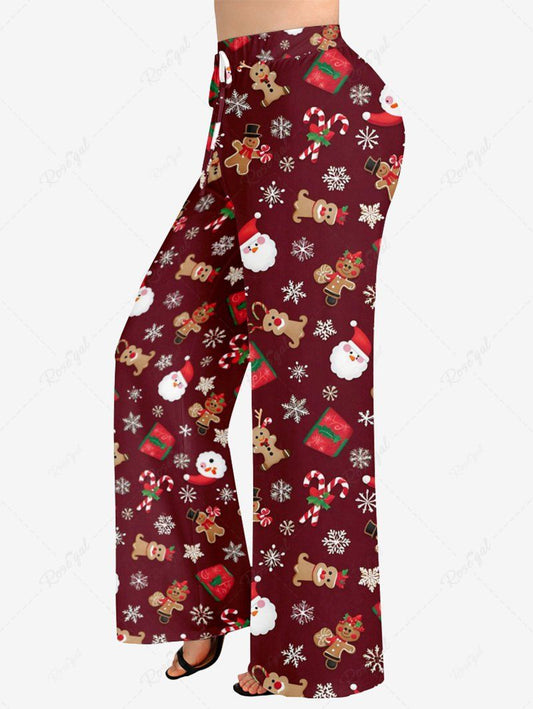 Plus Size Christmas Santa Claus Snowflake Gingerbread Candy Print Drawstring Wide Leg Pants