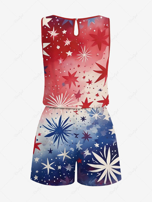 Plus Size Tie Dye Ombre Patriotic American Flag Fireworks Print Drawstring Pocket Romper