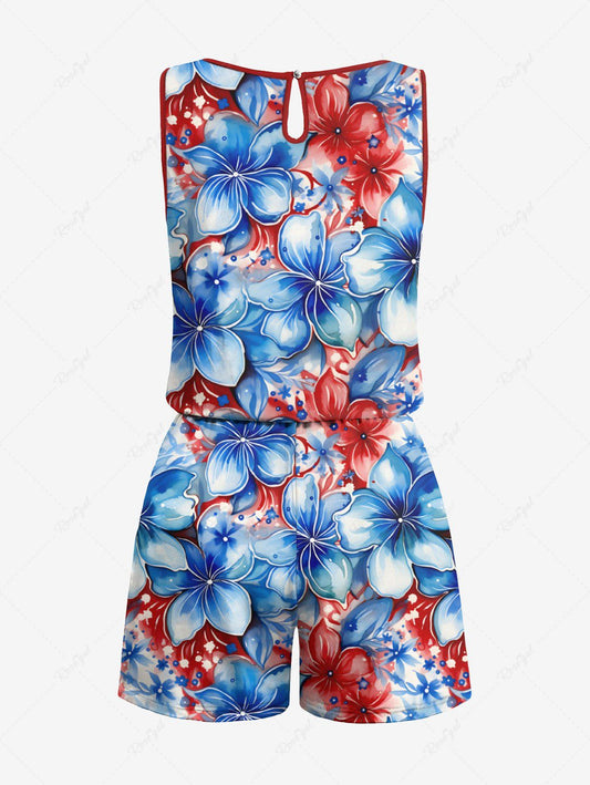 Plus Size Patriotic American Flag Floral Print Hawaii Drawstring Pocket Romper