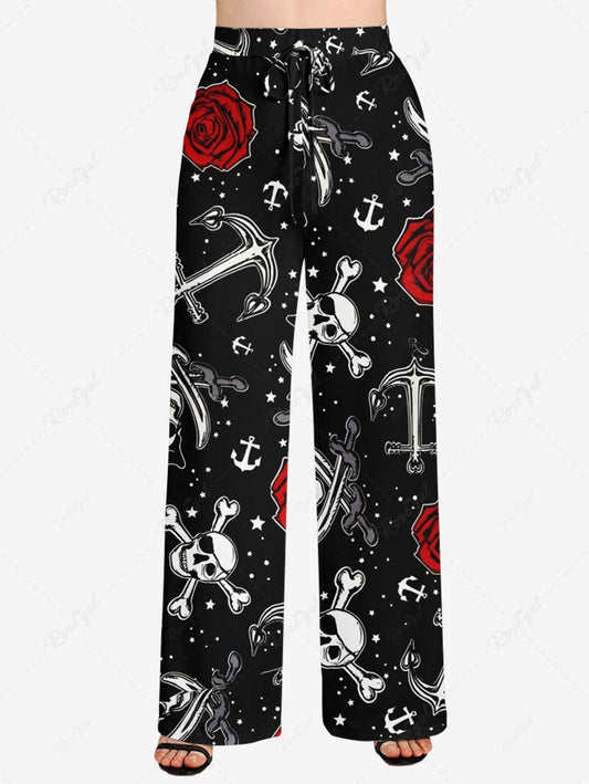 Plus Size Skull Rose Flower Star Anchor Printed Drawstring Wide Leg Pants