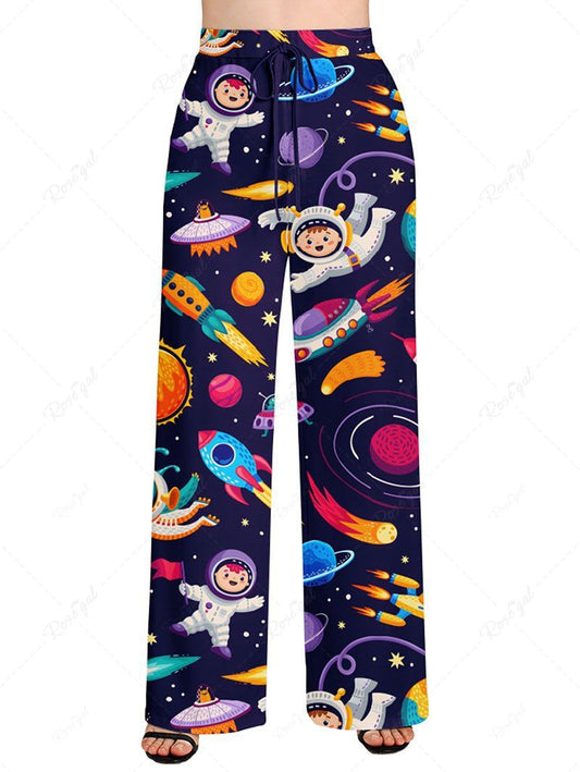 Plus Size Galaxy Planet Astronaut Spacecraft Printed Drawstring Wide Leg Pants