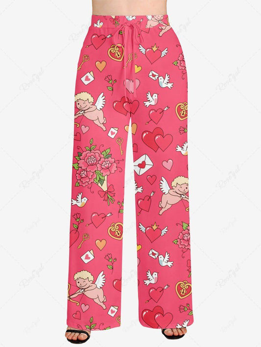 Plus Size Cupid Angel Flowers Heart Envelope Printed Drawstring Wide Leg Pants