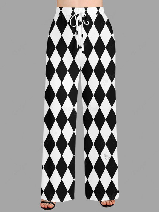Plus Size Two Tone Checkered Printed Drawstring Wide Leg Pants