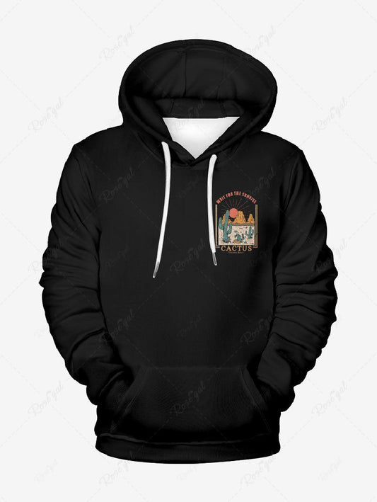 Plus Size Sunrise Mountain Cactus Letters Printed Pocket Drawstring Hoodie