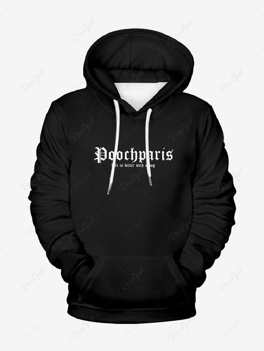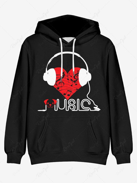 Plus Size Heart Music Symbol Earphone Letters Dog Printed Pocket Drawstring Pullover Long Sleeves Hoodie