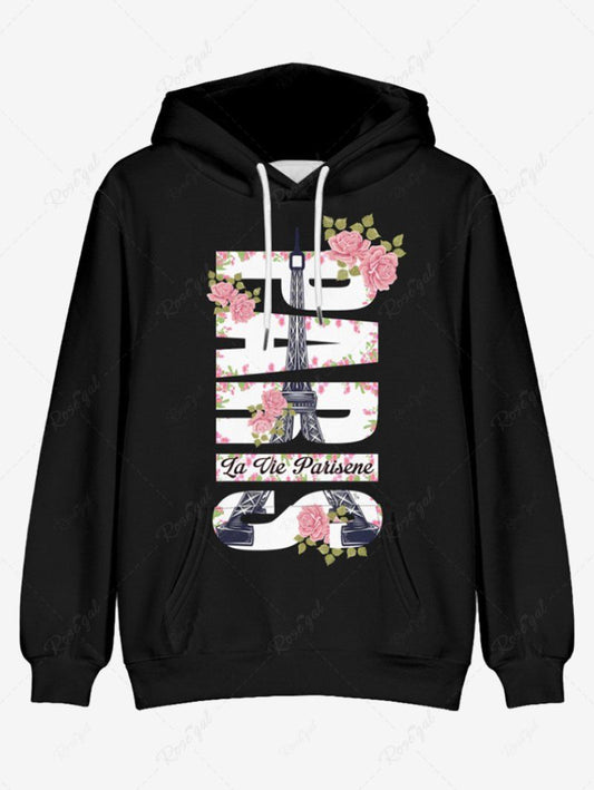 Plus Size Letters Rose Flower Eiffel Tower Printed Valentines Pocket Drawstring Pullover Long Sleeves Hoodie