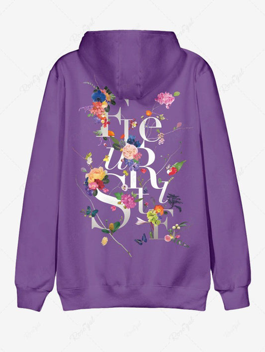 Plus Size Floral Leaves Butterfly Letters Printed Pocket Drawstring Pullover Long Sleeves Hoodie