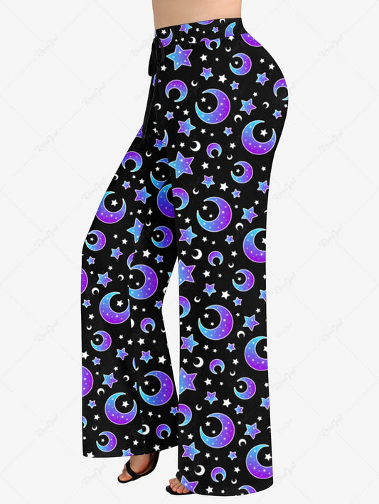 Plus Size Ombre Moon Stars Printed Drawstring Wide Leg Pants