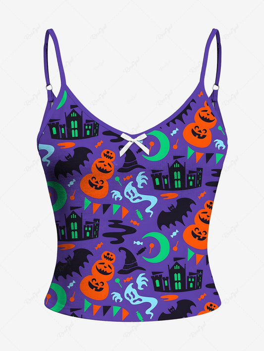 Pumpkin Bat Ghost Castle Moon Print Halloween Cami Top and Drawstring Shorts Pajama Set