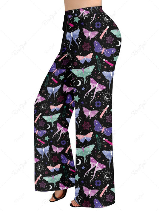 Plus Size Colorful Butterfly Sun Moon Stars Galaxy Print Drawstring Wide Leg Pants