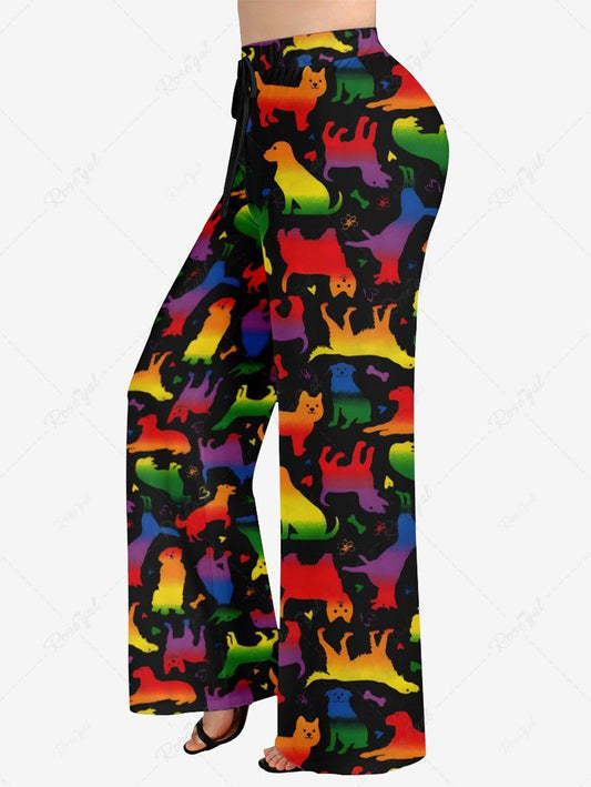 Plus Size Colorful Ombre Dog Print Drawstring Wide Leg Pants