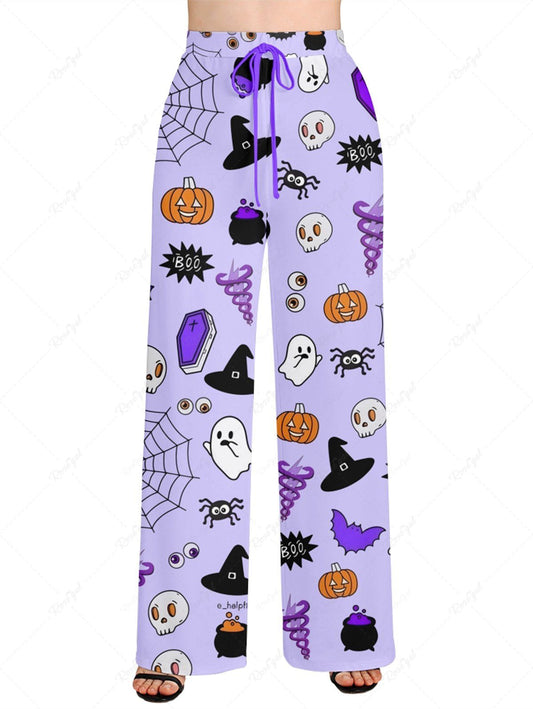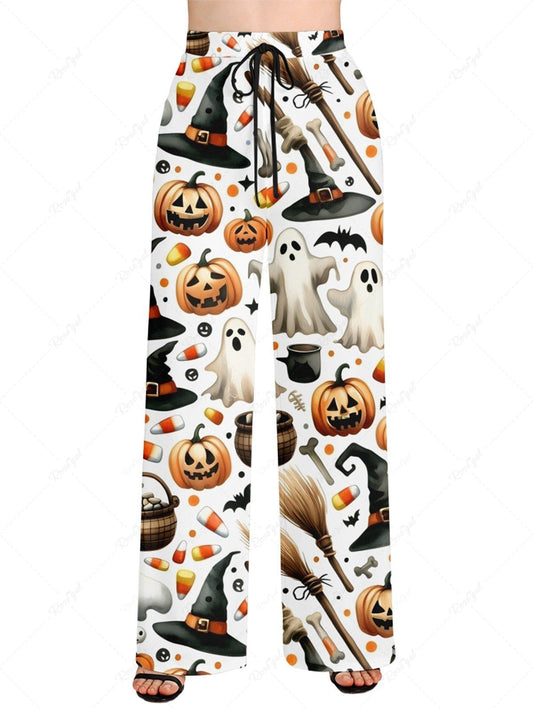 Plus Size Halloween Pumpkin Ghost Spider Web Skulls Eyes Print Drawstring Wide Leg Pants