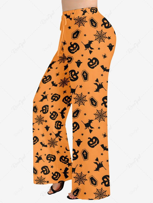 Plus Size Pumpkin Bat Spider Web Print Halloween Drawstring Wide Leg Pants