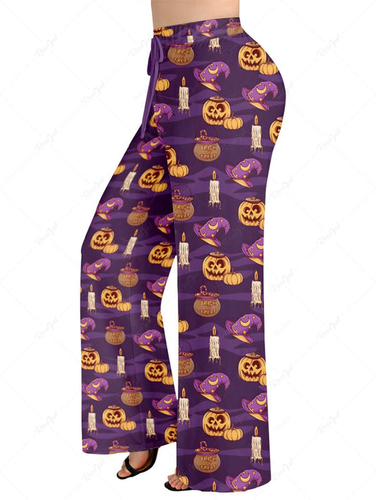 Plus Size Pumpkin Wizard Hat Candle Print Halloween Drawstring Wide Leg Pants