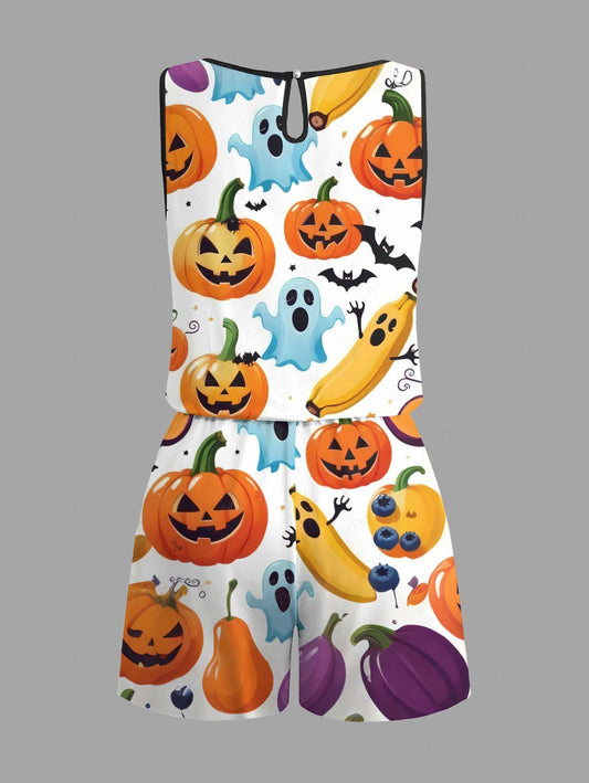 Plus Size Pumpkin Ghost Bat Bananas Print Halloween Drawstring Pocket Romper