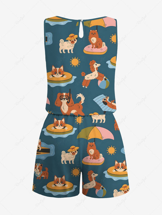 Plus Size Cute Dog Sun Beach Print Hawaii Drawstring Pocket Romper