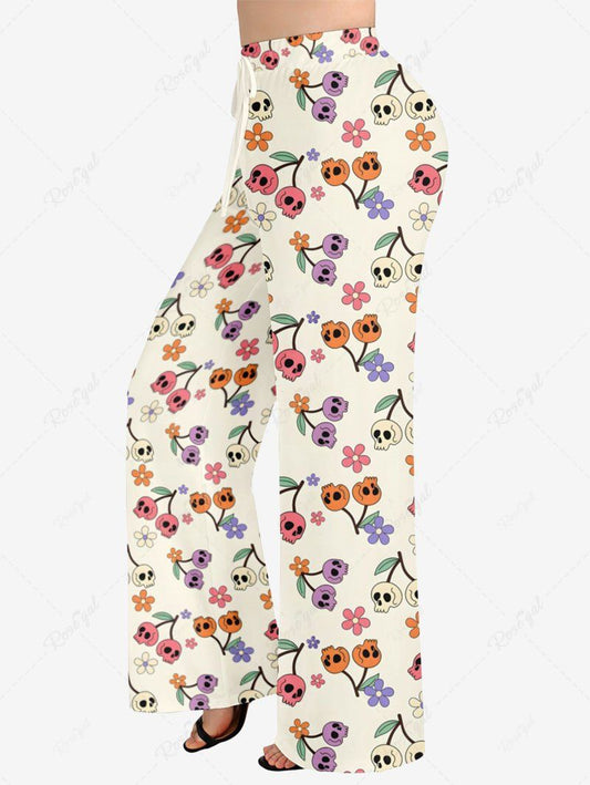 Plus Size Skull Cherry Flower Print Drawstring Pocket Wide Leg Pants