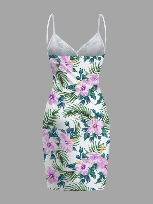 Plus Size Dogs Bones Tropocal Leaf Print Surplice Hawaii Cami Dress