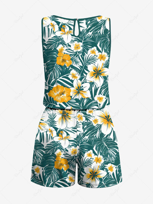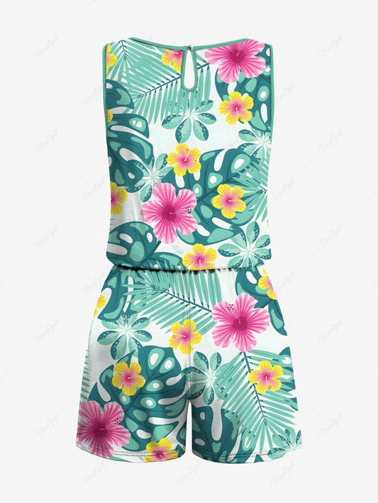 Plus Size Tropical Leaf Hibiscus Flower Printed Cinched Hawaii Romper