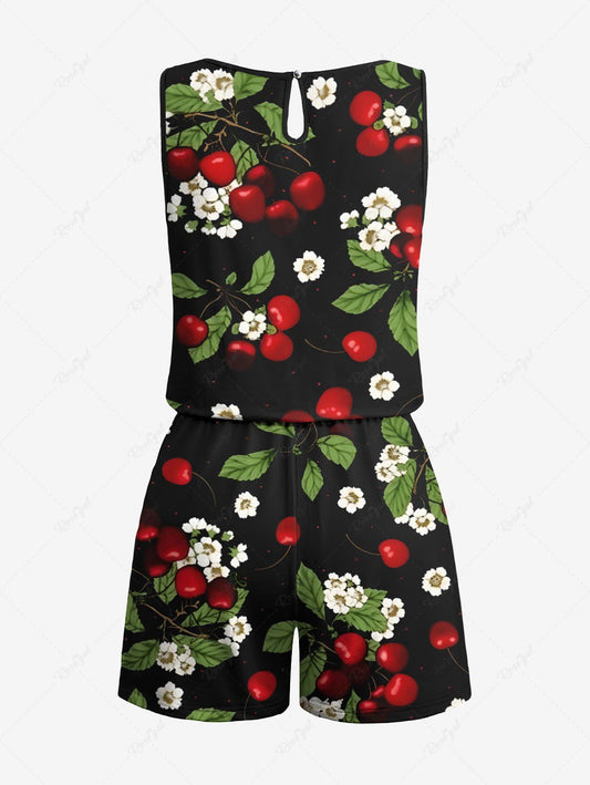 Plus Size Floral Leaves Cherry Printed Hawaii Drawstring Pocket Romper