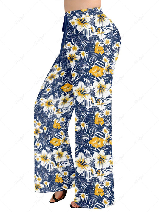Plus Size Tropical Leaves Hibiscus Floral Print Hawaii Drawstring Wide Leg Pants