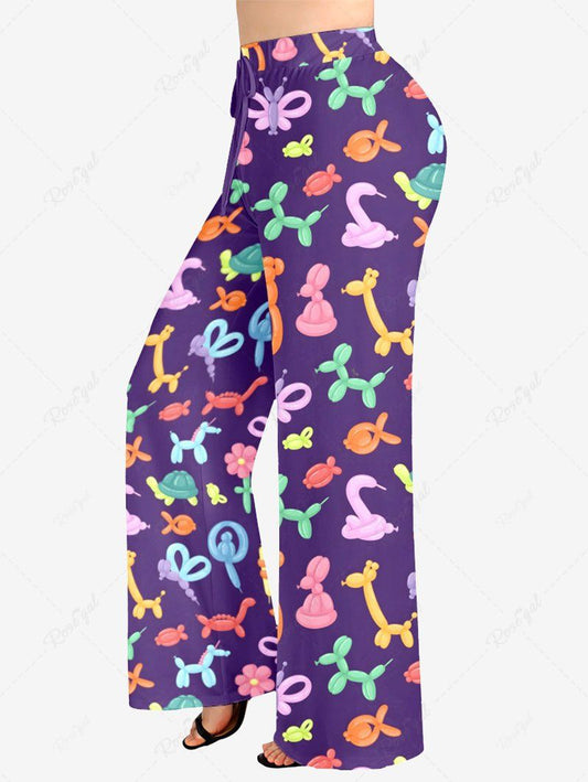 Plus Size Colorful Balloon Horse Butterfly Turtle Monkey Flower Printed Drawstring Wide Leg Pants