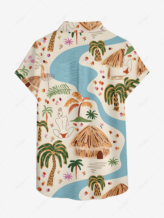 Coconut Tree River Floral Straw House Printed Hawaii Button Pocket Women Shirt