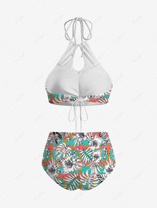 Floral Tropical Leaves Printed Hawaii Hollow Out Halter Backless Tankini Swimsuit