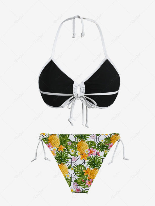 Floral Tropical Leaves Pineapple Geometric Graphic Printed Hawaii Cinched Halter Backless Bikini Set