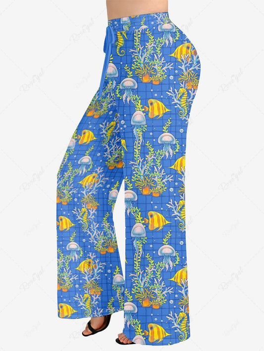 Plus Size Coral Waterweed Jellyfish Fish Seahorse Line Plaid Printed Hawaii Drawstring Wide Leg Pants