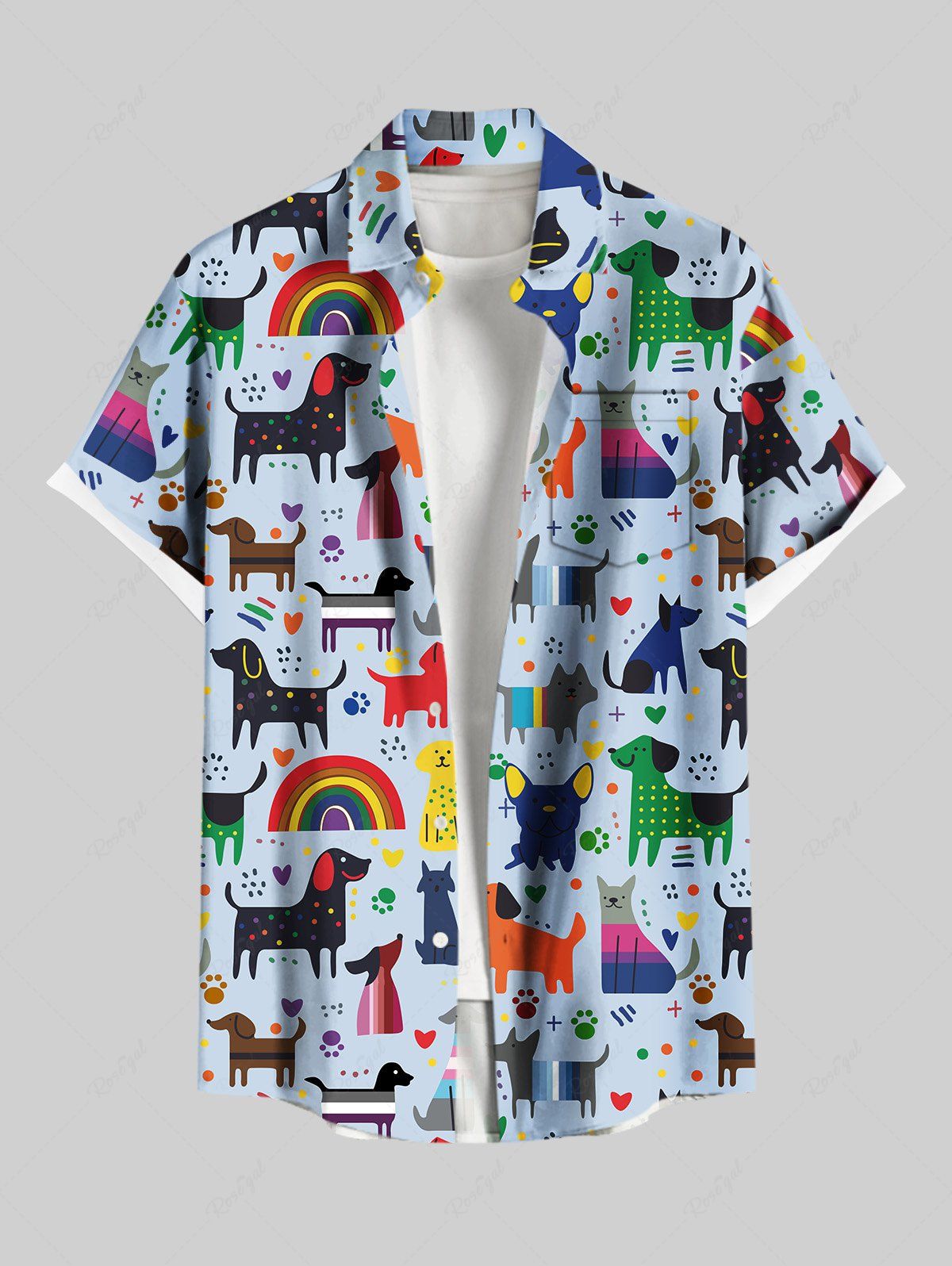 Plus Size Colorful Dogs Rainbow Heart Foot Printed Buttons Pocket Shirt For Men