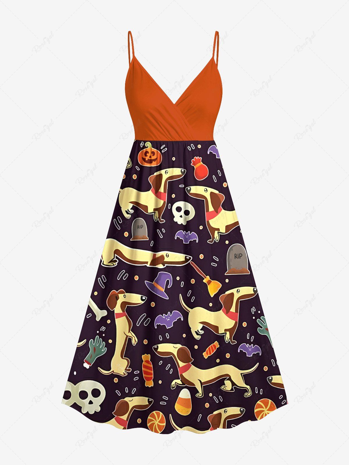 Plus Size Dog Skull Pumpkin Bat Candy Print Halloween Surplice A Line Cami Dress