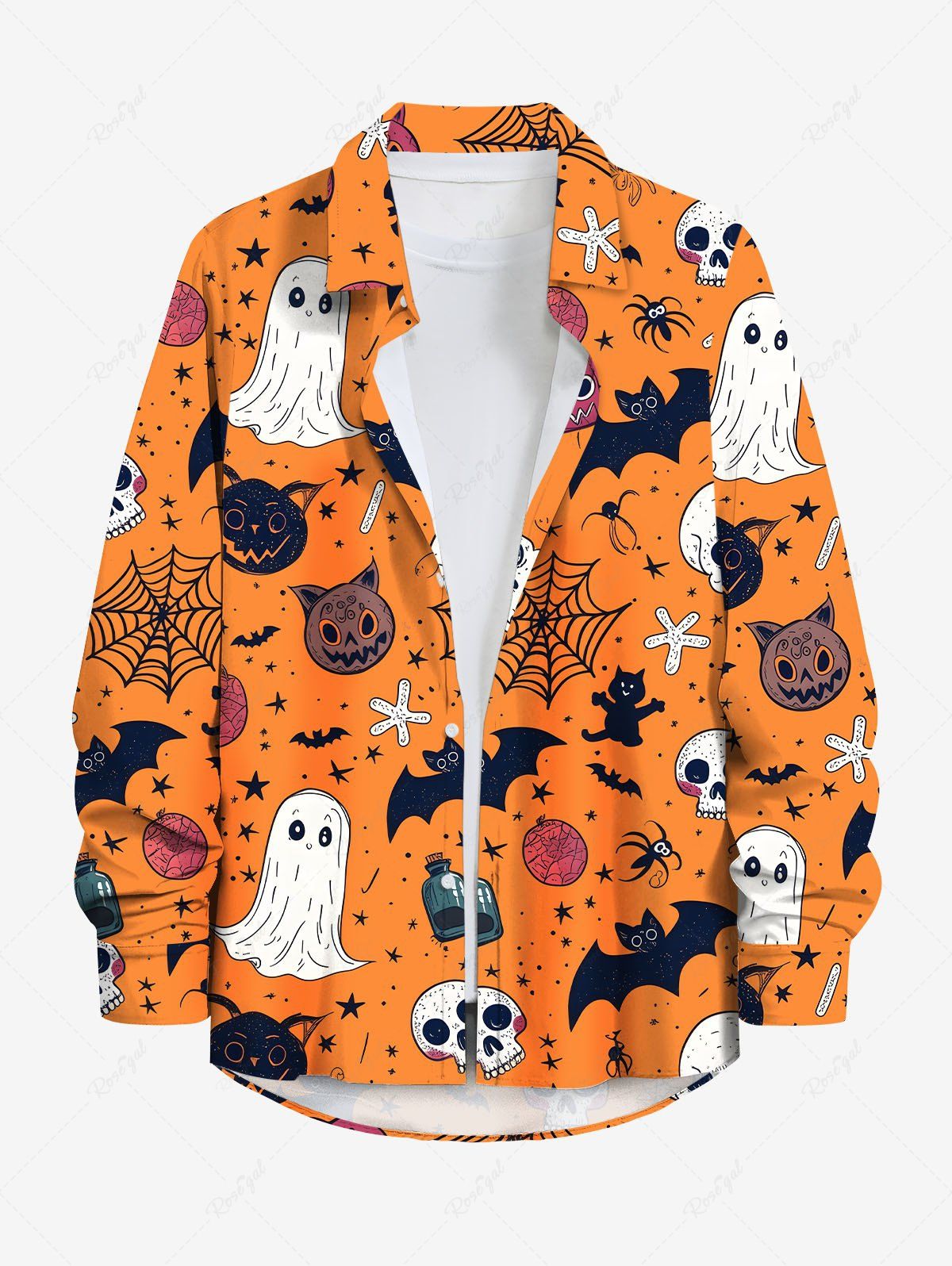 Plus Size Halloween Pumpkin Skull Ghost Spider Web Print Buttons Pocket Long Sleeves Shirt For Men