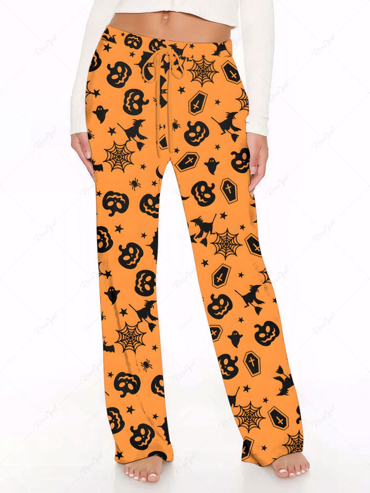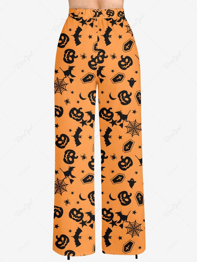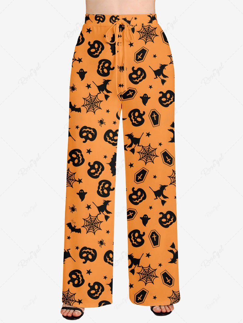 Plus Size Pumpkin Bat Spider Web Print Halloween Drawstring Wide Leg Pants