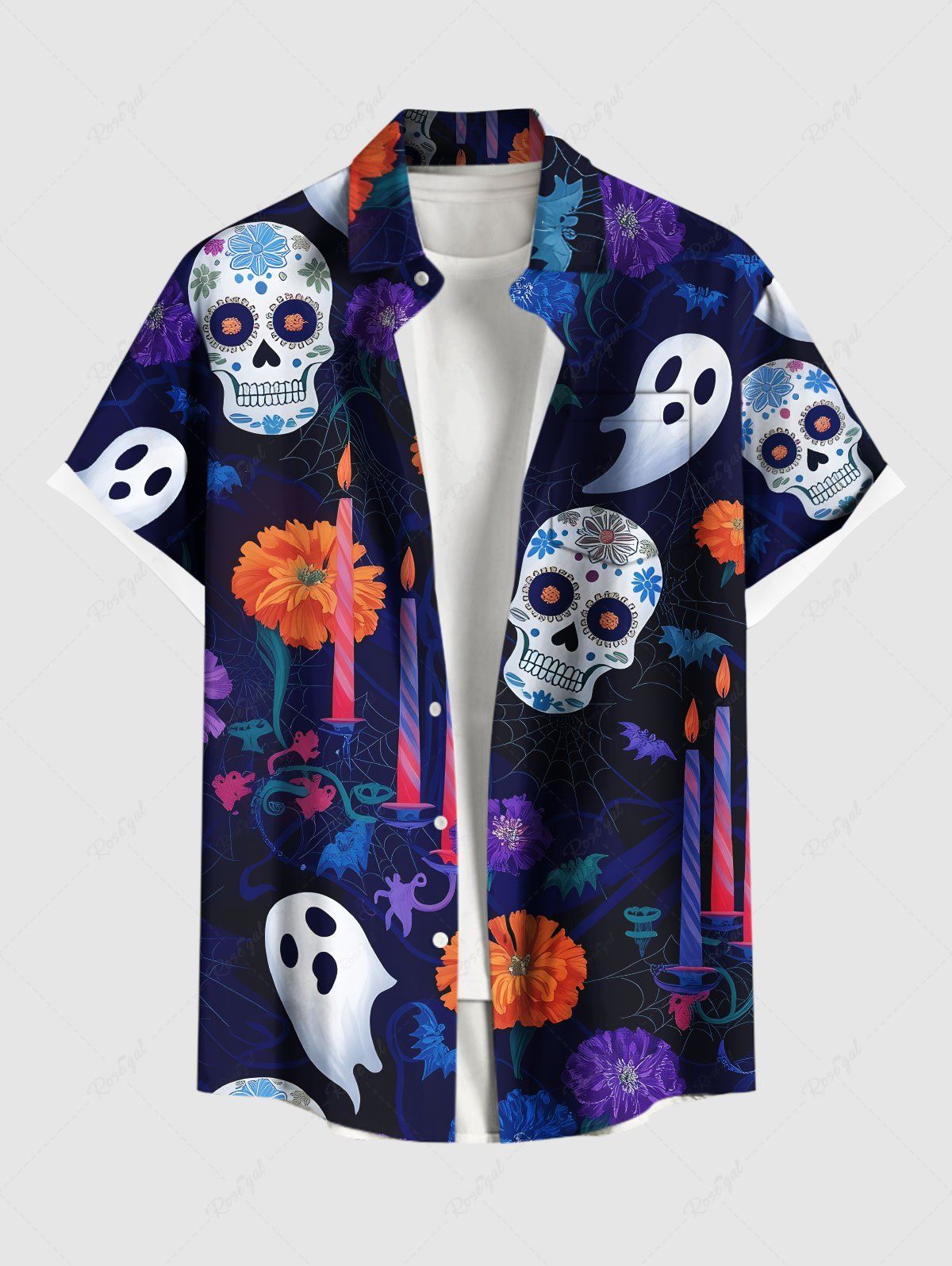 Plus Size Skull Flower Ghost Candle Print Halloween Button Pocket Shirt For Men